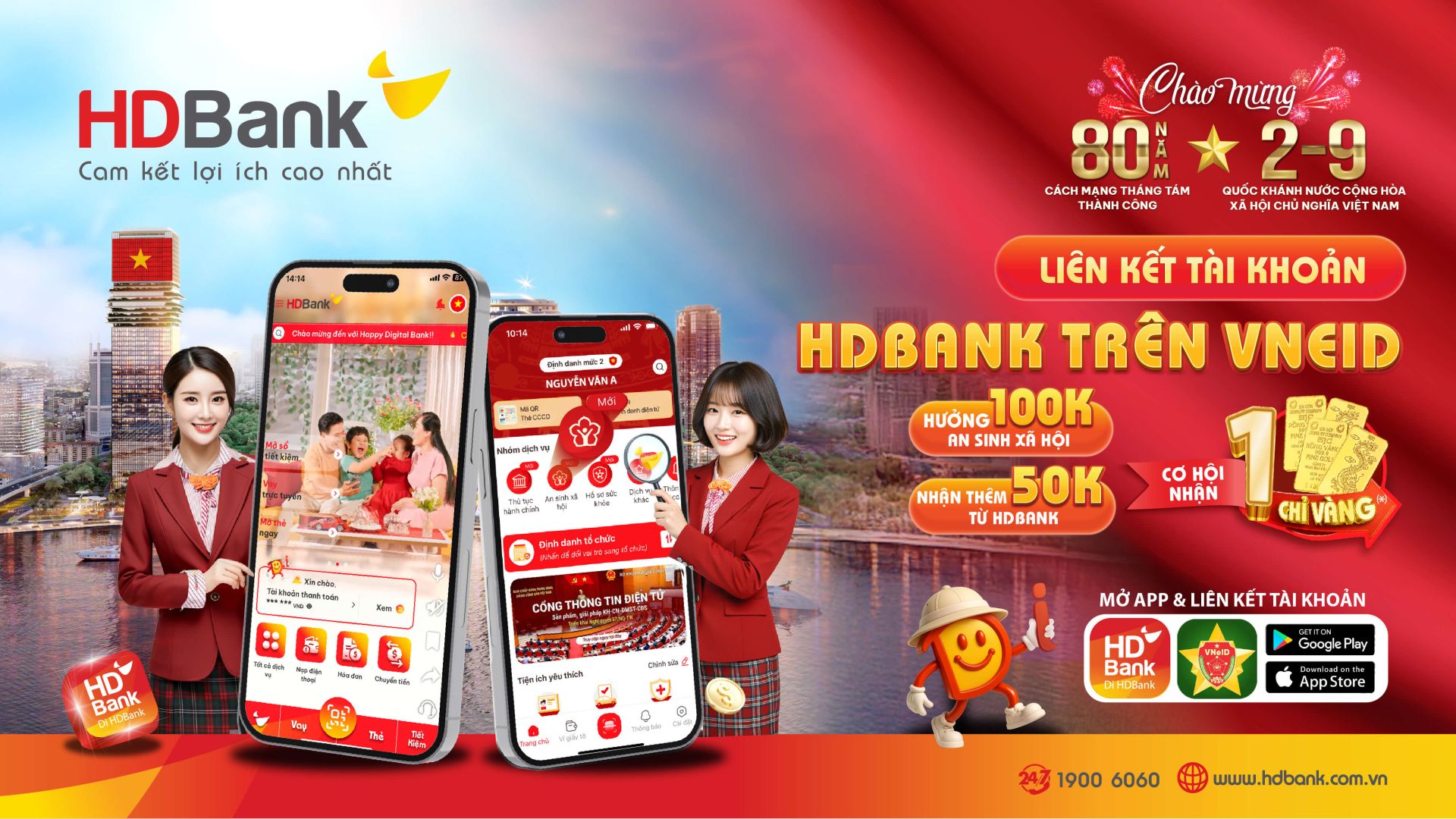 Khách hàng mới, khi mở tài khoản HDBank và liên kết thành công với tài khoản an sinh xã hội trên ứng dụng VNeID sớm nhất sẽ được nhận ngay 50.000 đồng vào tài khoản HDBank (áp dụng cho 10.000 khách hàng sớm nhất).