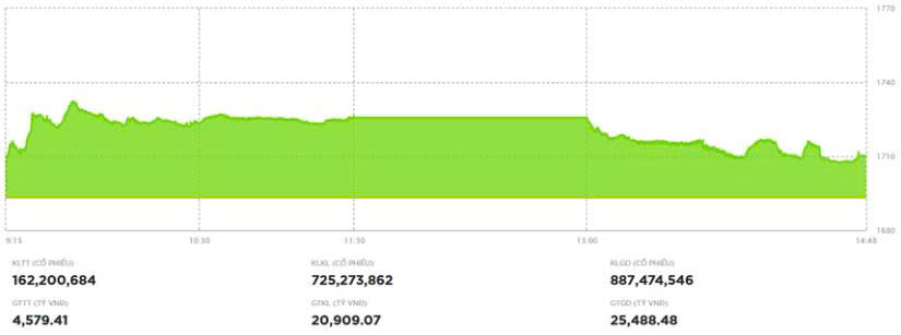 Đóng cửa, sàn HOSE có 179 mã tăng và 147 mã giảm, VN-Index tăng 17,08 điểm (+1,01%), lên 1.710,29 điểm. Tổng khối lượng đạt hơn 887,4 triệu đơn vị, giá trị 25.488,5 tỷ đồng, chỉ tăng nhẹ hơn 1% về khối lượng và 6% về giá trị so với phiên hôm qua. Giao dịch thỏa thuận đóng góp hơn 162,2 triệu đơn vị, giá trị 4.579 tỷ đồng.