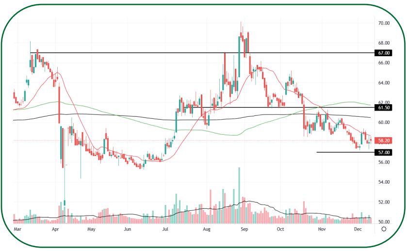 Về mặt kỹ thuật, mặc dù chưa có tín hiệu vượt đường MA(20) nhưng VCB đang có một số tín hiệu có thể kìm hãm xu hướng điều chỉnh bắt đầu từ cuối tháng 8/2025. Đồng thời vùng hỗ trợ 57 cũng đang làm tốt nhiệm vụ nâng đỡ giá. Những dao động hỗ trợ gần đây có thể tạo kỳ vọng VCB sớm vượt đường MA(20) và chuyển hướng tăng ngắn hạn trong thời gian tới.
