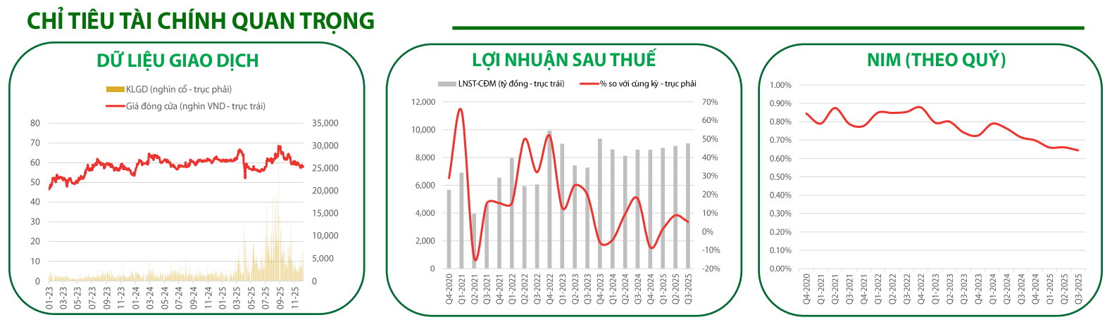 Hoạt động tín dụng tiếp tục là điểm tựa khi tăng trưởng tín dụng ngân hàng mẹ đạt 12,2% từ đầu năm, vượt tốc độ chung của toàn ngành. Tín dụng cá nhân tăng 15%, trong khi tín dụng dành cho doanh nghiệp FDI tăng 17%. Ở chiều ngược lại, thu nhập ngoài lãi giảm do hoạt động ngoại hối kém thuận lợi và việc dừng ghi nhận phí trả trước bancassurance. Dù vậy, thu hồi nợ xấu duy trì tích cực, tiếp tục hỗ trợ một phần quan trọng cho nguồn thu.