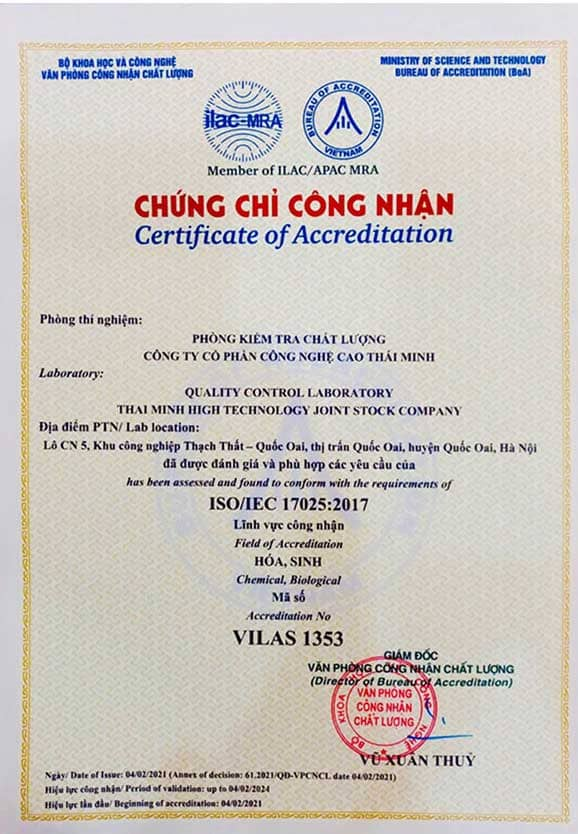 Nhà máy, hệ thống phòng thí nghiệm: Nhà máy Thái Minh Hitech đạt tiêu chuẩn GMP, đảm bảo sản phẩm được kiểm nghiệm 100% đầu ra. Hệ thống phòng thí nghiệm đạt chuẩn ISO 17025, đảm bảo kiểm soát chất lượng nghiêm ngặt.