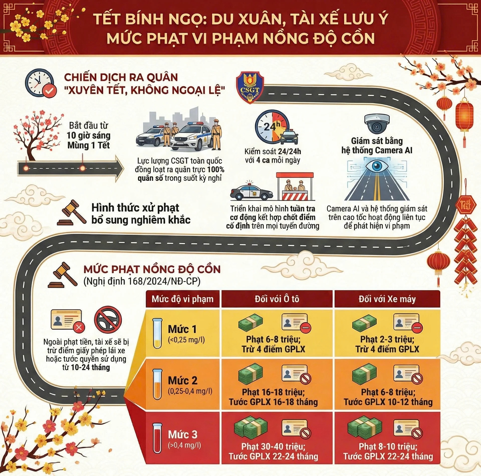 Theo đại diện Cục CSGT, căn cứ lịch nghỉ Tết của người lao động từ ngày 14/2 đến hết 22/2, lực lượng CSGT toàn quốc sẽ ứng trực 100%, triển khai cao điểm bảo đảm an toàn giao thông kéo dài thêm 2 ngày trước và sau kỳ nghỉ. Mục tiêu là phòng ngừa tai nạn, hạn chế ùn tắc và xử lý nghiêm các hành vi vi phạm là nguyên nhân trực tiếp dẫn đến tai nạn giao thông.