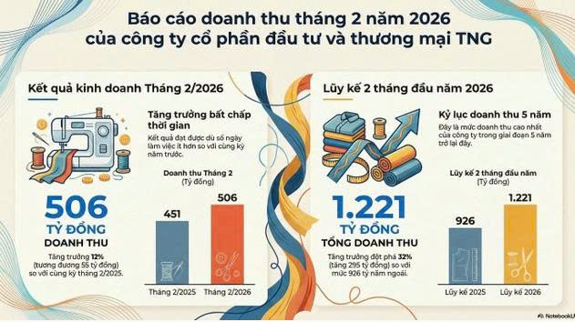 Lũy kế hai tháng đầu năm, CTCP Đầu tư và Thương mại TNG ghi nhận doanh thu đạt 1.221 tỷ đồng, tăng 32% so với cùng kỳ và đồng thời thiết lập mức cao nhất trong vòng 5 năm trở lại đây, phản ánh tín hiệu tích cực về nhịp độ đơn hàng cũng như năng lực triển khai sản xuất ngay từ giai đoạn đầu năm.