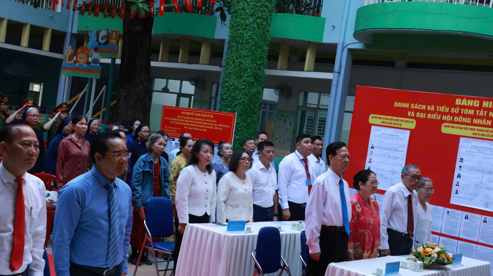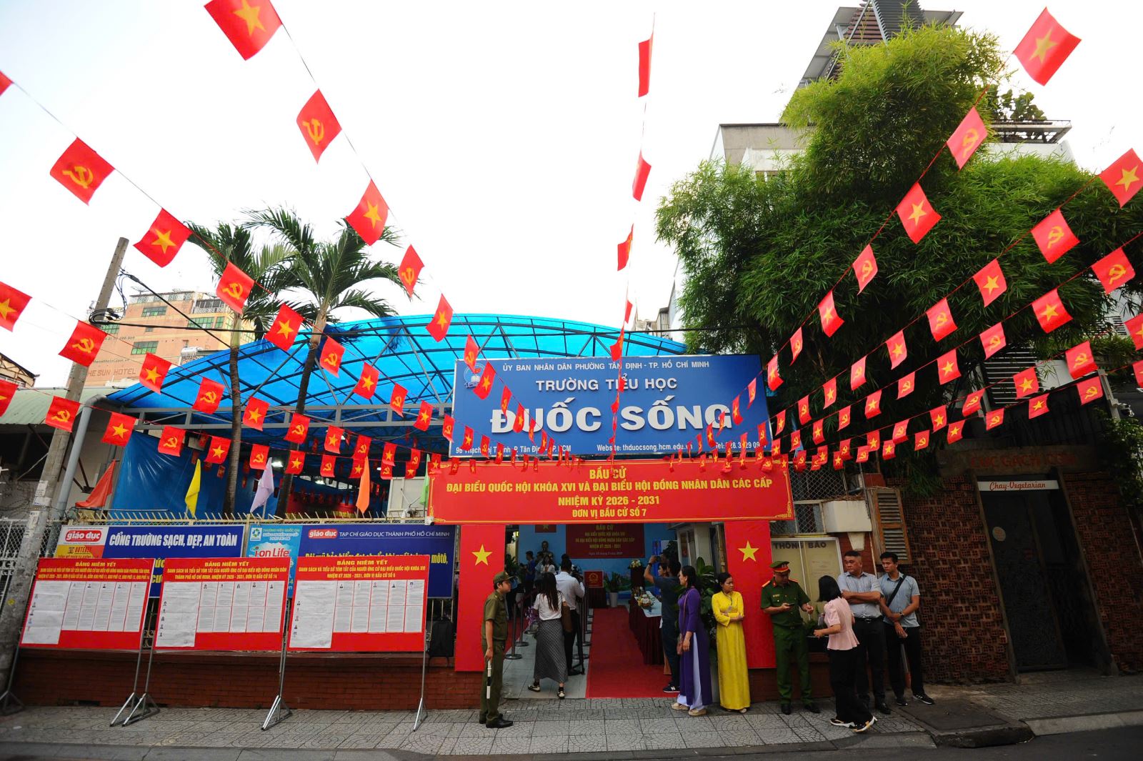 Tại khu vực bỏ phiếu số 14 xã Hóc Môn, từ 6 giờ sáng, không khí đã nhộn nhịp và sẵn sàng cho ngày hội toàn dân. Điểm bầu cử số 14 là điểm bỏ phiếu của 2.000 cử tri. Công tác an ninh được đảm bảoBên trong khu vực bỏ phiếu, không khí chuẩn bị khá khẩn trương để đảm bảo đúng thời gian làm lễ khai mạcỦy viên Bộ Chính trị, Chủ tịch Quốc hội Trần Thanh Mẫn và Ủy viên Bộ Chính trị, Bí thư Thành ủy TP. Hồ Chí Minh Trần Lưu Quang đã có mặt tại điểm bầu cử ở xã Hóc MônTại khu vực bỏ phiếu số 2 (Trường Mầm non Tuổi thơ 7) phường Xuân Hoà có ông Nguyễn Tấn Dũng, nguyên Ủy viên Bộ Chính trị, nguyên Thủ tướng Chính phủ và ông Nguyễn Văn Được, Ủy viên Trung ương Đảng, Phó Bí thư Thành ủy, Chủ tịch UBND Thành phố tham dựTừ sáng sớm, đã có khá đông cử tri đến tham dự lễ khai mạcCác cử tri xem thông tin các ứng cử viên tại điểm bỏ phiếu số 12, đơn vị số 4 (Trường THPT Nguyễn Chí Thanh) phường Tân BìnhCử tri xem thông tin các ứng cử viên tại phường Long TrườngTại điểm bầu cử số 7, phường Tân Định có nguyên Chủ tịch nước Trương Tấn Sang và Phó Bí Thư Thường trực Thành uỷ Lê Quốc Phong tham dựCử tri 100 tuổi Trần Thị Húc, phường Tân Bình đã có mặt từ sớm để tham gia thực hiện quyền cử tri của mìnhCụ Trần Thị Húc (sinh năm 1926), hiện sinh sống tại khu phố 4, phường Tân Bình, là một trong những cử tri cao tuổi tiêu biểu của địa phươngĐúng 7 giờ, các điểm bỏ phiếu thực hiện nghi thức lễ khai mạc bầu cửSau đó, các điểm bỏ phiếu thực hiện niêm phong thùng phiếu để cử tri chuẩn bị bỏ phiếu