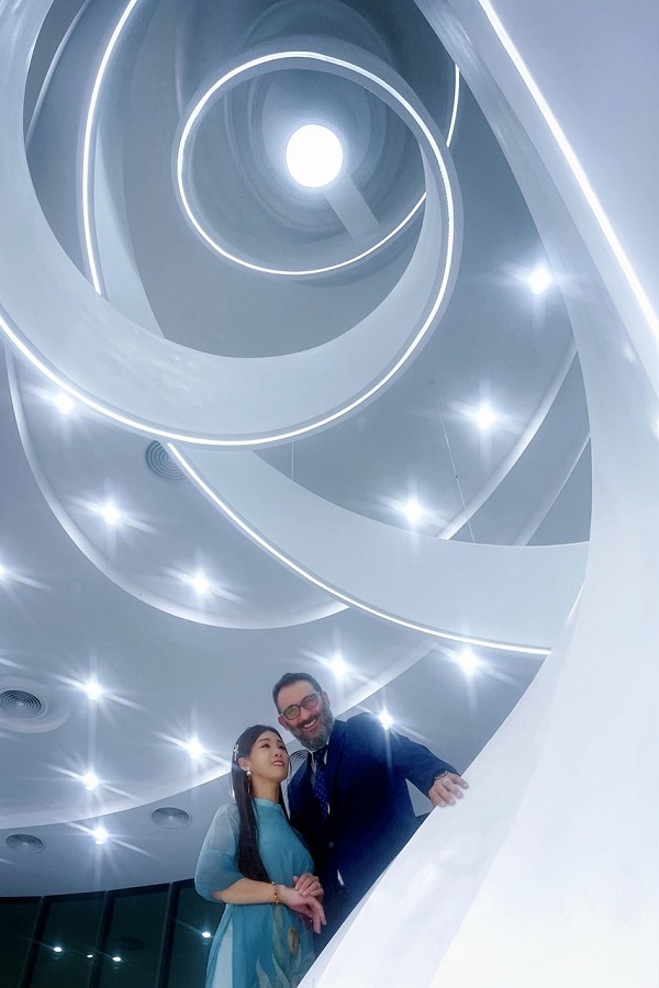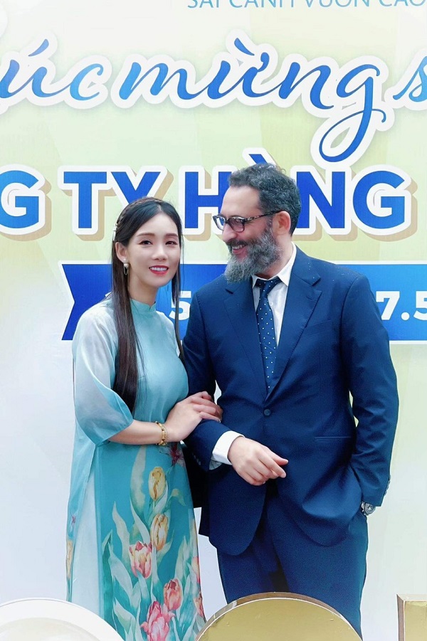 Cặp đôi dành nhiều cử chỉ tình cảm lãng mạn cho nhau trong lễ khai trương công trình do chính Paolo Vitale thiết kế cho hãng hàng không Vietnamairline mới đây.