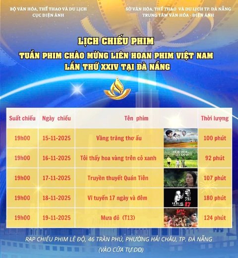 Từ ngày 15 đến 19/11, tại rạp Lê Độ (46 Trần Phú, Hải Châu), Trung tâm Văn hóa - Điện ảnh TP. Đà Nẵng tổ chức Tuần phim chào mừng Liên hoan Phim Việt Nam lần thứ XXIV, với các suất chiếu miễn phí lúc 19 giờ hàng ngày, mang đến cơ hội để khán giả và khách thập phương thưởng thức những tác phẩm điện ảnh tiêu biểu của Việt Nam.