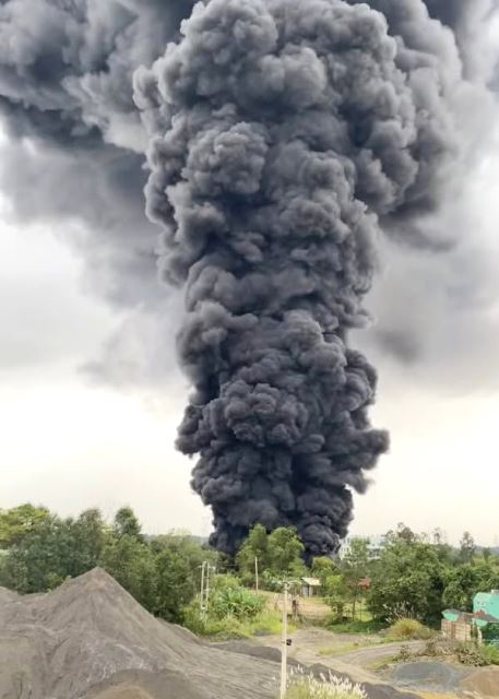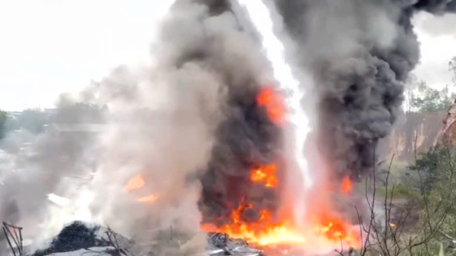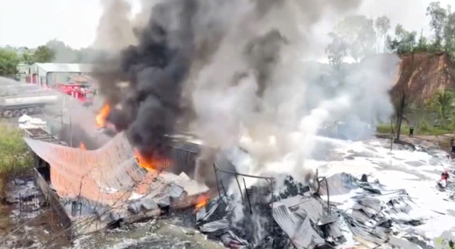 Ghi nhận tại hiện trường, cột khói đen đặc cuộn cao hàng chục mét, bao trùm cả khu vực. Một số người dân cho biết, trước thời điểm ngọn lửa bùng lên, họ nghe thấy một tiếng nổ lớn phát ra từ khu vực kho xưởng.