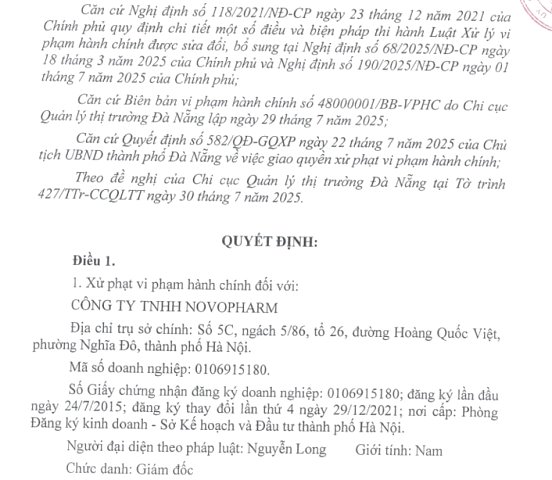 Trước đó, Phòng Cảnh sát kinh tế, Công an TP. Đà Nẵng kiểm tra tại địa điểm kinh doanh của NOVOPHARM ở số 109 Lý Thái Tông, phường Thanh Khê, phát hiện việc bảo quản thuốc không đúng điều kiện ghi trên nhãn và không có giấy chứng nhận đủ điều kiện kinh doanh dược. Hồ sơ vụ việc được chuyển cho Chi cục Quản lý thị trường TP. Đà Nẵng theo đúng thẩm quyền quy định tại Nghị định 117.