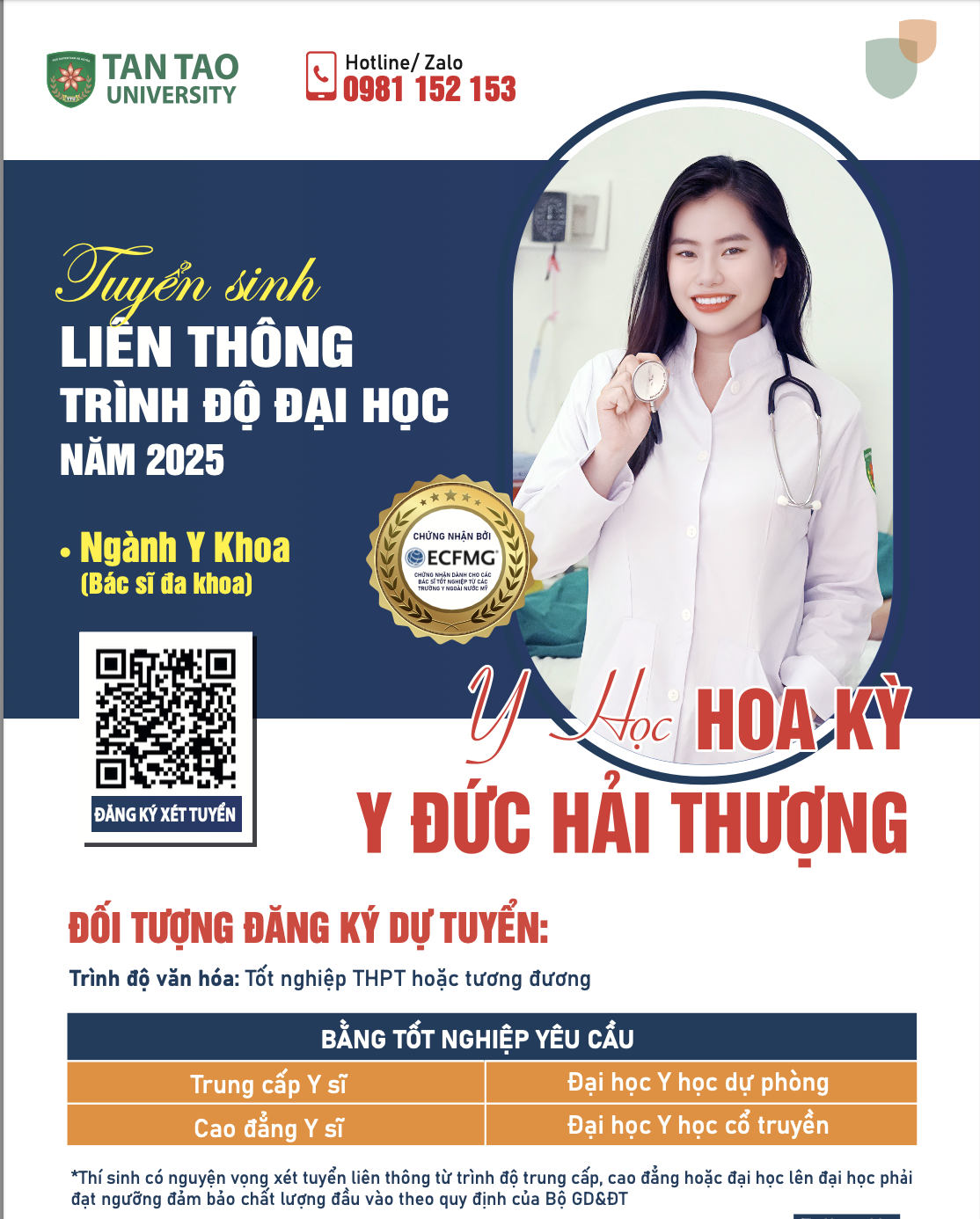 Bên cạnh chương trình đào tạo từ xa, năm 2025 Trường Đại học Tân Tạo tuyển sinh liên thông trình độ Đại học ngành Y khoa (Bác sỹ Đa khoa) với phương thức xét tuyển hoặc thi tuyển. Giảm 30% cho sinh viên khóa đầu tiên.
