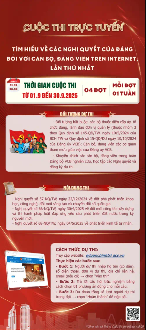 Thực hiện Công văn số 379-CV/ĐU ngày 18/8/2025 của Đảng ủy Chính phủ về việc triển khai Cuộc thi trực tuyến tìm hiểu về các nghị quyết của Đảng đối với cán bộ, đảng viên trên Internet, lần thứ nhất, Đảng ủy Ngân hàng TMCP Ngoại thương Việt Nam đã ban hành Công văn phát động hưởng ứng cuộc thi, yêu cầu các cấp ủy, tổ chức Đảng trực thuộc tăng cường tuyên truyền, vận động và tạo điều kiện để 100% cán bộ, đảng viên thuộc diện yêu cầu tham gia.