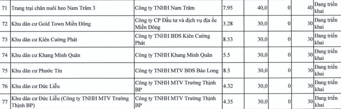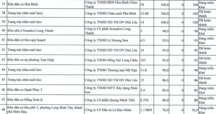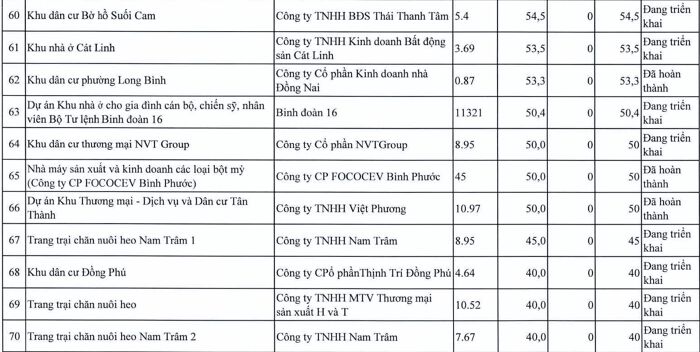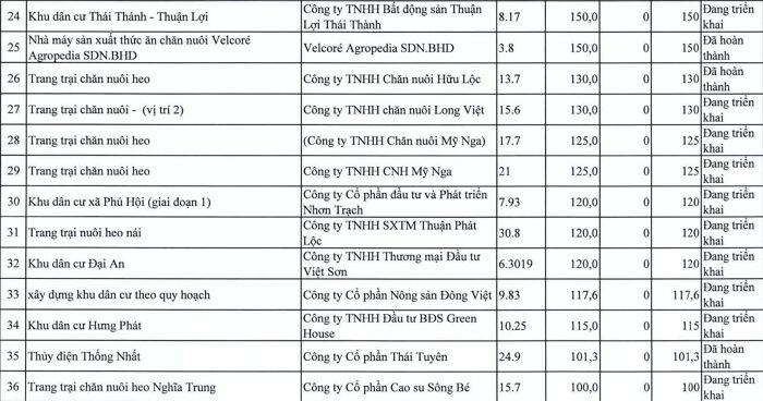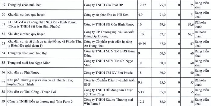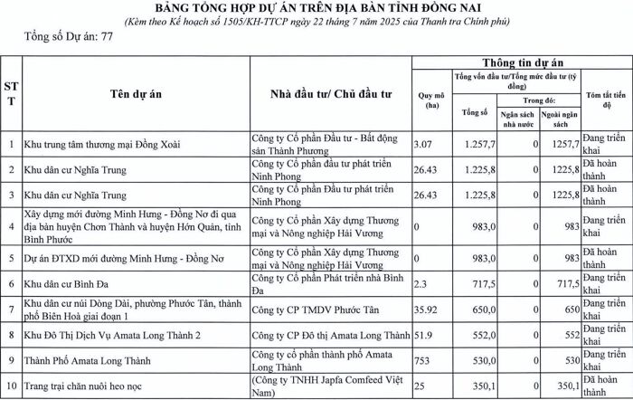 Còn lại 77 dự án sẽ do Thanh tra tỉnh Đồng Nai thực hiện chủ yếu là dự án khu dân cư thương mại và dự án trang trại nuôi heo của tỉnh Đồng Nai và tỉnh Bình Phước (cũ). Danh sách các dự án Thanh tra tỉnh Đồng Nai được Thanh tra Chính Phủ giao thanh tra, gồm: