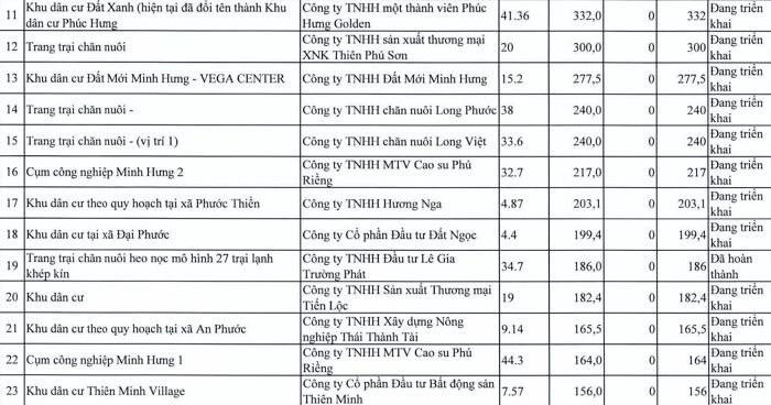 Cụ thể, 8 dự án do Thanh tra Chính Phủ trực tiếp thanh tra gồm: Dự án khu đô thị dịch vụ Amata Long Thành 1 với quy mô hơn 55ha do Công ty Cổ phần đô thị Amata Long Thành – Khu đô thị dịch vụ Chi nhánh 1 làm chủ đầu tư; Dự án cải tạo cảnh quan và phát triển đô thị ven sông Đồng Nai với diện tích 8,4ha do Công ty cổ phần đầu tư xây dựng kiến trúc Toàn Thịnh Phát làm chủ đầu tư; Dự án khu đô thị du lịch Long Tân với quy mô 332ha do Tổng công ty cổ phần Đầu tư phát triển xây dựng (Tập đoàn DIC) làm chủ đầu tư; Dự án khu dân cư dịch vụ và du lịch Cù lao Tân Vạn với quy mô hơn 48ha do Công ty cổ phần đầu tư Tín Nghĩa Á Châu làm chủ đầu tư; Dự án Nhà máy điện năng lượng mặt trời Lộc Ninh 3 quy mô hơn trên 149ha do Công ty Cổ phần năng lượng Lộc Ninh 3 làm chủ đầu tư; Dự án khu dân cư theo quy hoạch diện tích hơn 40,1ha do Công ty Cổ phần Long Thành Riverside làm chủ đầu tư; Dự án Nhà máy thủy điện Đức Thành diện tích 7,8ha do Công ty Cổ phần thủy điện Trường Sơn - Bình Phước làm chủ đầu tư; Dự án khu dân cư Phước Thắng diện tích 56,5ha do Công ty TNHH công nghiệp – bất động sản và xây dựng Song Phương làm chủ đầu tư.