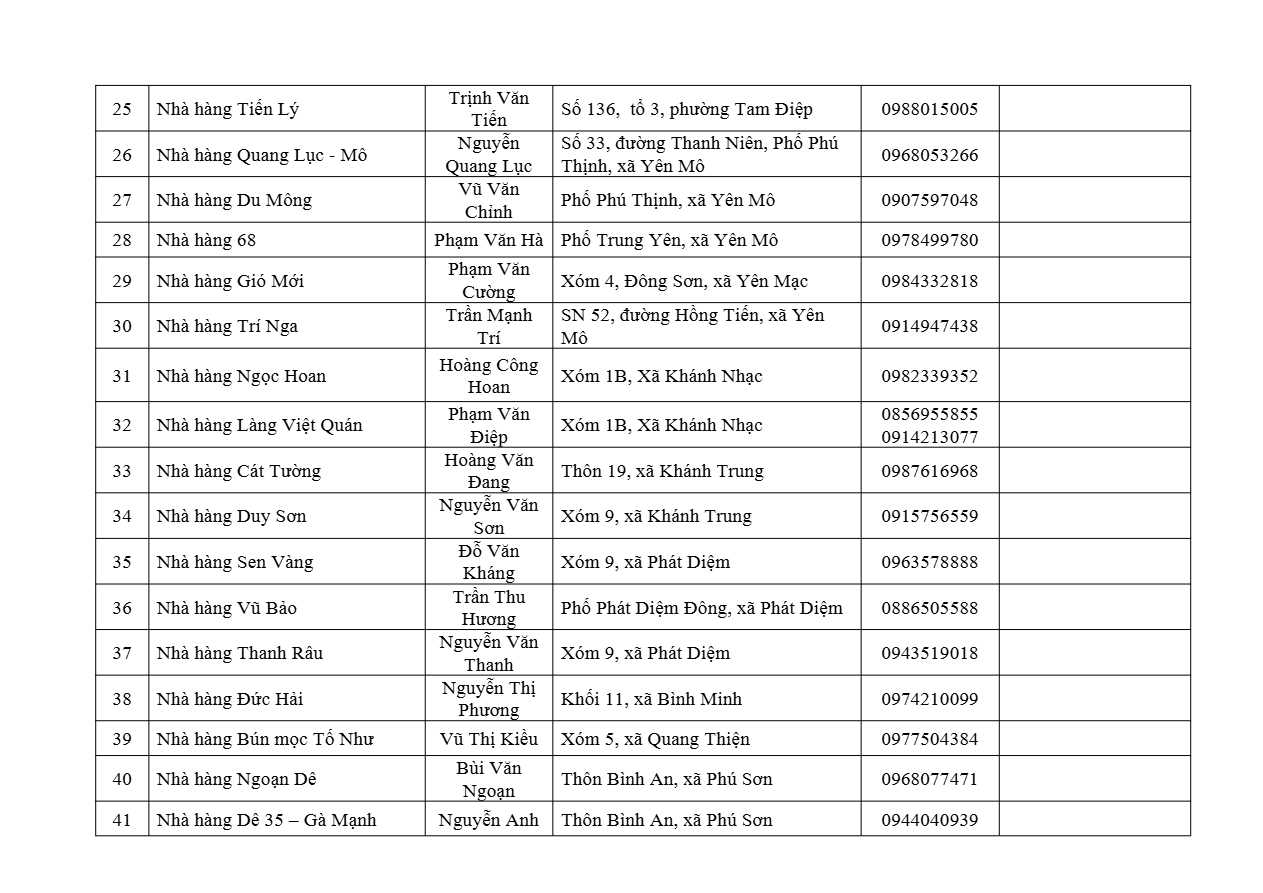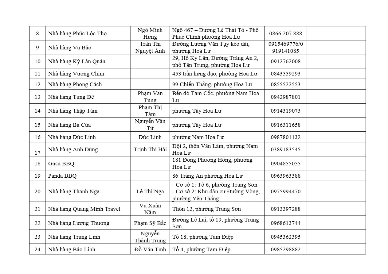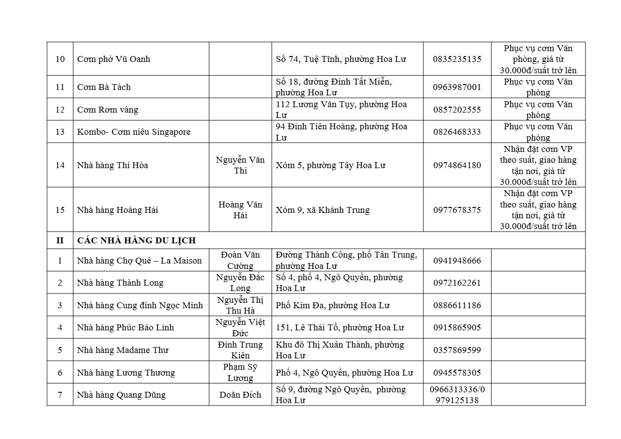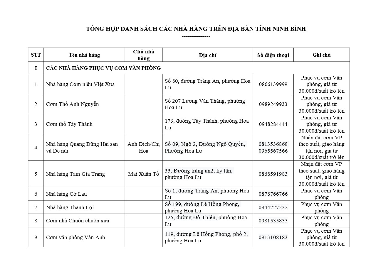 Danh sách cụ thể các cơ sở phục vụ cơm văn phòng (có đính kèm đầy đủ thông tin về địa chỉ, số điện thoại liên hệ, hình thức phục vụ…) sẽ được cập nhật thường xuyên trên trang thông tin điện tử của Sở Du lịch Ninh Bình, đồng thời gửi trực tiếp tới các đơn vị thông qua văn bản chính thức.