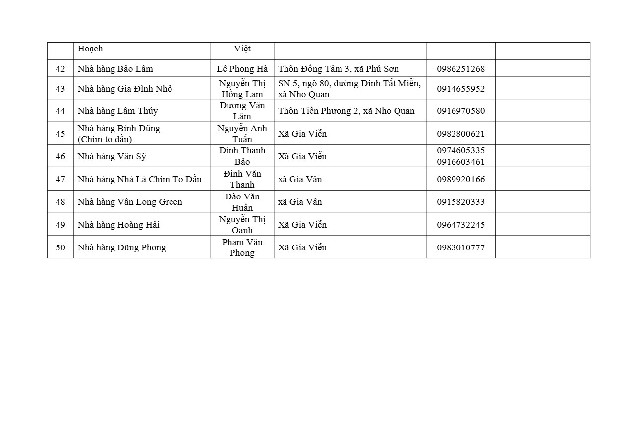 Danh sách bao gồm các nhà hàng, quán ăn, cơ sở dịch vụ ăn uống tại trung tâm thành phố Ninh Bình và một số khu vực lân cận, đáp ứng các tiêu chí về chất lượng dịch vụ, thực đơn phong phú, giá cả phù hợp, có khả năng phục vụ tại chỗ và giao hàng tận nơi.