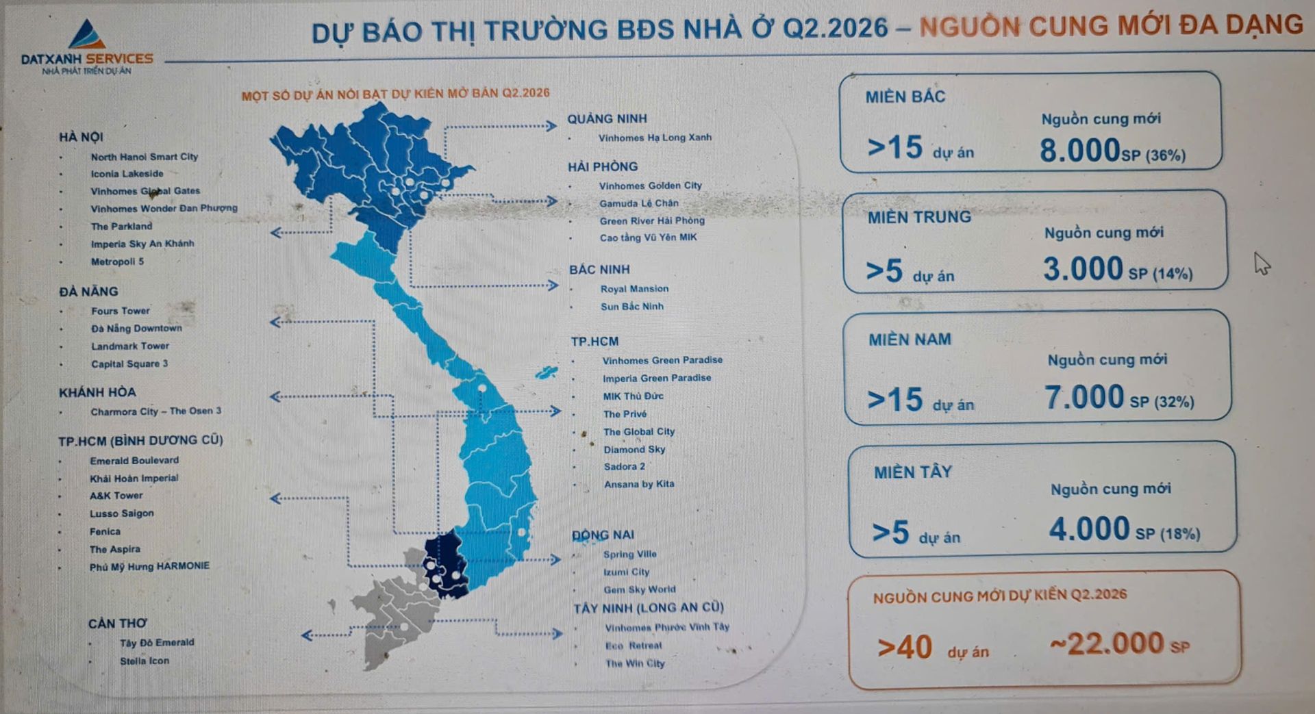 Theo báo cáo của Dat Xanh Services – FERI, bước sang năm 2026, thị trường bất động sản TP. HCM ghi nhận tín hiệu phục hồi về nguồn cung sau giai đoạn trầm lắng trước đó. Khu vực phía Nam, với TP. HCM là đầu tàu, chứng kiến lượng sản phẩm mới tăng mạnh, chủ yếu đến từ các dự án quy mô lớn do những chủ đầu tư có tiềm lực triển khai.