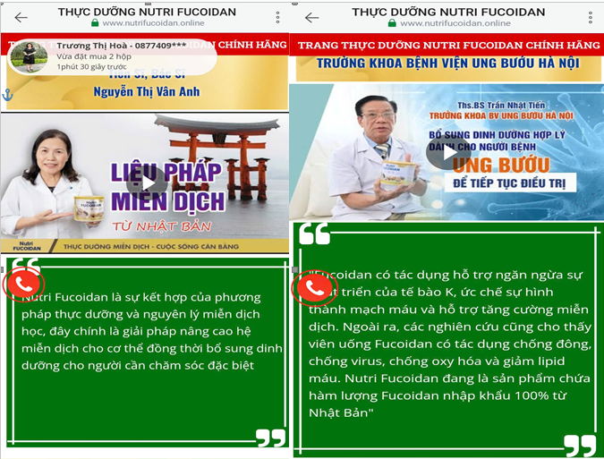 Đơn cử, website “trang.store” đăng tải hàng loạt các clip về các chuyên gia y tế như: Tiến sĩ, Bác sĩ Nguyễn Thị Vân Anh, Nguyên trưởng khoa nội - Viện Y học cổ truyền – BQP; TTƯT.Ths.Bs Hoàng Khánh Toàn – Nguyên Chủ nghiệm Khoa Y học cổ truyền, Bệnh viện Trung ương Quân đội 108… nói về Thực dưỡng miễn dịch Nutri Fucoidan, công dụng của sản phẩm Nutri Fucoidan Plus đối với người bệnh, và các bệnh nhân đang mắc bệnh ung thư.