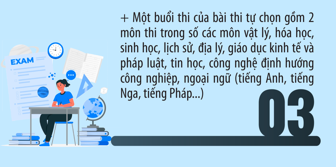 Năm nay, thí sinh sẽ dự thi trong 3 buổi, 2 buổi đầu thi Ngữ văn và Toán, buổi còn lại thi 2 môn tự chọn trong số 9 môn đã học ở bậc THPT. "Quan trọng nhất ở đây là thí sinh lựa chọn môn dự thi tốt nghiệp THPT phù hợp với các môn nằm trong tổ hợp môn xét tuyển vào trường đại học mình mong muốn", TS. Lê Mỹ Phong nói.