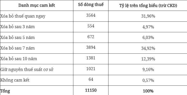 Trong khuôn khổ Hiệp định Thương mại tự do giữa Việt Nam và Các Tiểu vương quốc Ả-rập Thống nhất (UAE), Việt Nam cam kết lộ trình cắt giảm/xóa bỏ thuế nhập khẩu tại Tiểu phụ lục 2A-b của Hiệp định. Mức độ tự do hóa thuế nhập khẩu của Việt Nam theo Hiệp định CEPA là 90,3% (không tính 264 mã hàng được phân loại là bộ linh kiện đồng bộ (CKD - Completely Knocked Down)), còn lại là các mặt hàng không cắt giảm thuế nhập khẩu và không cam kết. Cụ thể như sau: