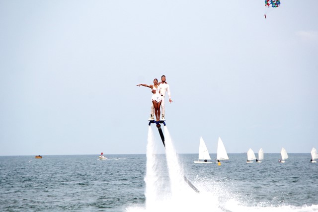 Theo đó, màn đồng diễn quy tụ nhiều bộ môn đặc trưng của du lịch biển như: Jet ski, thuyền buồm, cano kéo dù và flyboard, tạo nên không gian trình diễn sống động ngay trên mặt nước. Đặc biệt, phần biểu diễn flyboard của Jessica và Tommy - những vận động viên flyboard hàng đầu thế giới - gây ấn tượng mạnh với những động tác kỹ thuật cao, giàu cảm xúc.