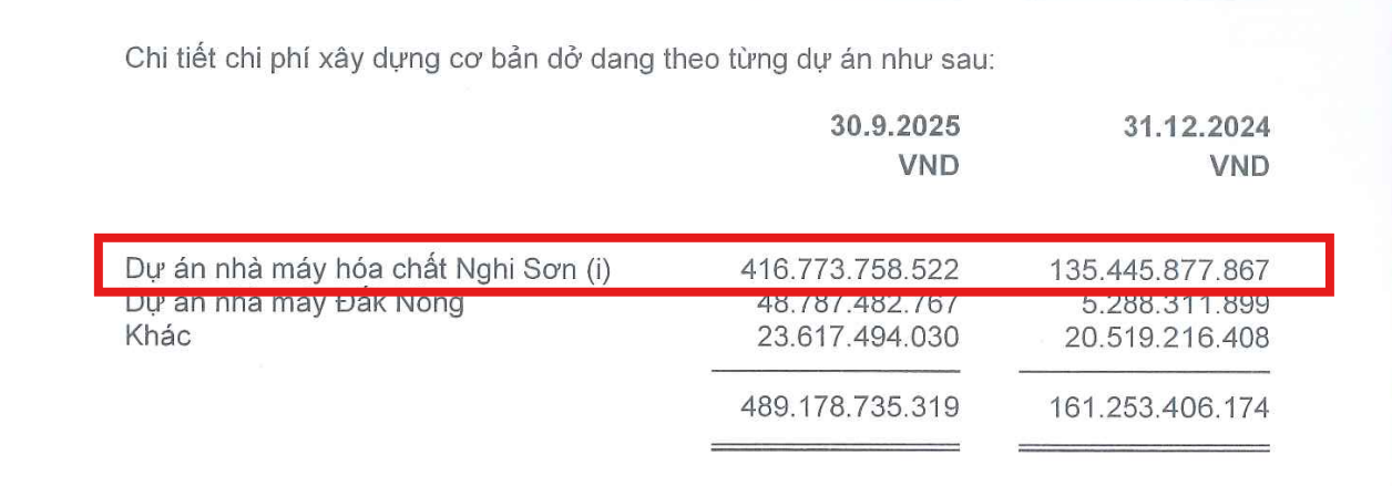 Theo báo cáo tài chính quý III/2025, đến cuối tháng 9, Hóa chất Đức Giang đã giải ngân 416 tỷ đồng cho hoạt động đầu tư xây dựng cơ bản tại tổ hợp Nghi Sơn, tức tăng hơn 280 tỷ đồng so với đầu năm.