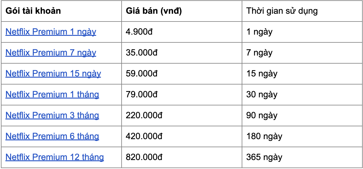 Lưu ý: Mức giá mua tài khoản Netflix Premium của chúng tôi là cố định. Không thay đổi mật khẩu, gói cước, phương thức thanh toán hoặc Profile của người khác. Không chia sẻ tài khoản cho người khác và chỉ sử dụng đúng số thiết bị/Profile đã thanh toán. Tài khoản Việt Nam chỉ dùng tại Việt Nam; tài khoản quốc tế cần có VPN hỗ trợ khi xem. Khi mua bạn chỉ cần nhập Gmail, số điện thoại, đơn vị này sẽ chủ động tạo và gửi tài khoản cho bạn qua Email |