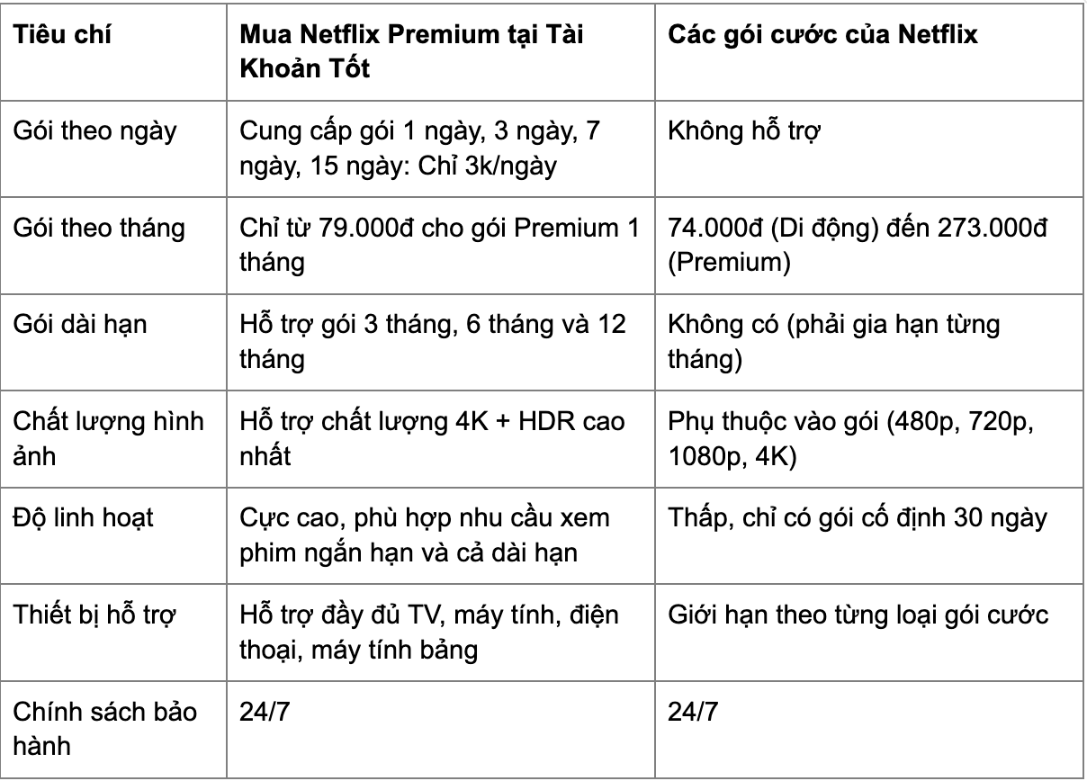 Dưới đây là một số điều bạn sẽ nhận được khi mua tài khoản Netflix Premium tại Tài Khoản Tốt so với mua trực tiếp của Netflix: