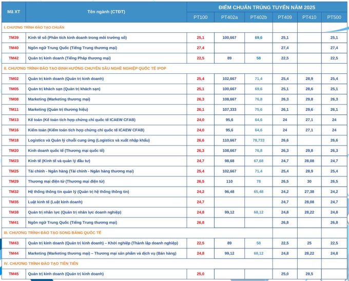 Điểm chuẩn Đại học Thượng mại năm 2025 ở tất cả ngành và phương thức như sau: