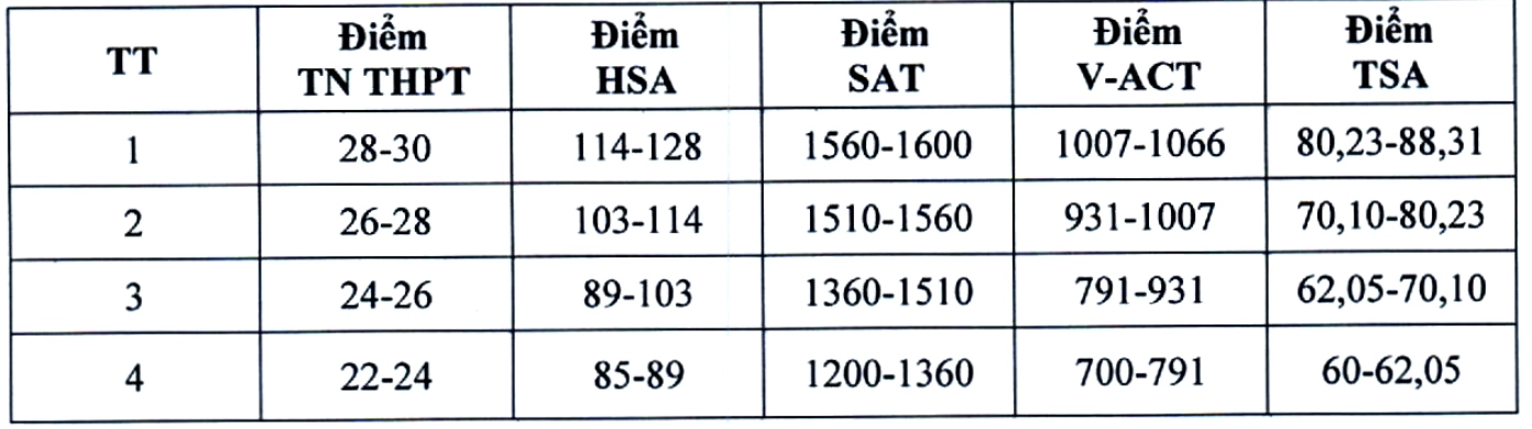 Bên cạnh đó, Đại học Kinh tế Quốc dân cũng thông báo bảng quy đổi tương đương điểm chuẩn giữa các phương thức. Điểm tuyệt đối theo điểm thi tốt nghiệp THPT bằng 128/150 điểm đánh giá năng lực (HSA) và 88,31 điểm đánh giá tư duy (TSA). Cụ thể như sau: