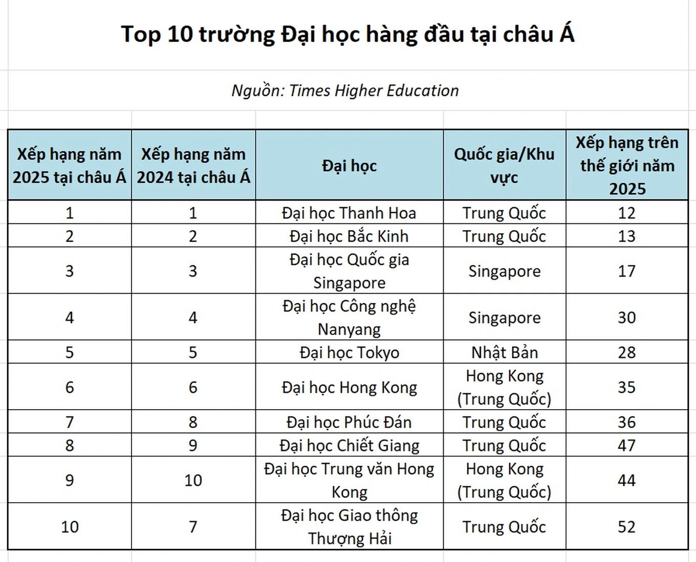 Xét trong khu vực Châu Á, Trung Quốc 'thống trị' bảng xếp hạng khi Đại học Thanh Hoa và Đại học Bắc Kinh vẫn giữ nguyên vị trí thứ nhất và thứ hai, đồng thời cũng là quốc gia duy nhất có 7 đại học lọt vào TOP 10.