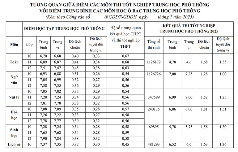Bảng này so sánh tương quan giữa kết quả thi tốt nghiệp THPT năm 2025 và điểm học tập 3 năm lớp 10, 11, 12 ở bậc phổ thông (điểm học bạ) của học sinh lớp 12 trên cả nước.
