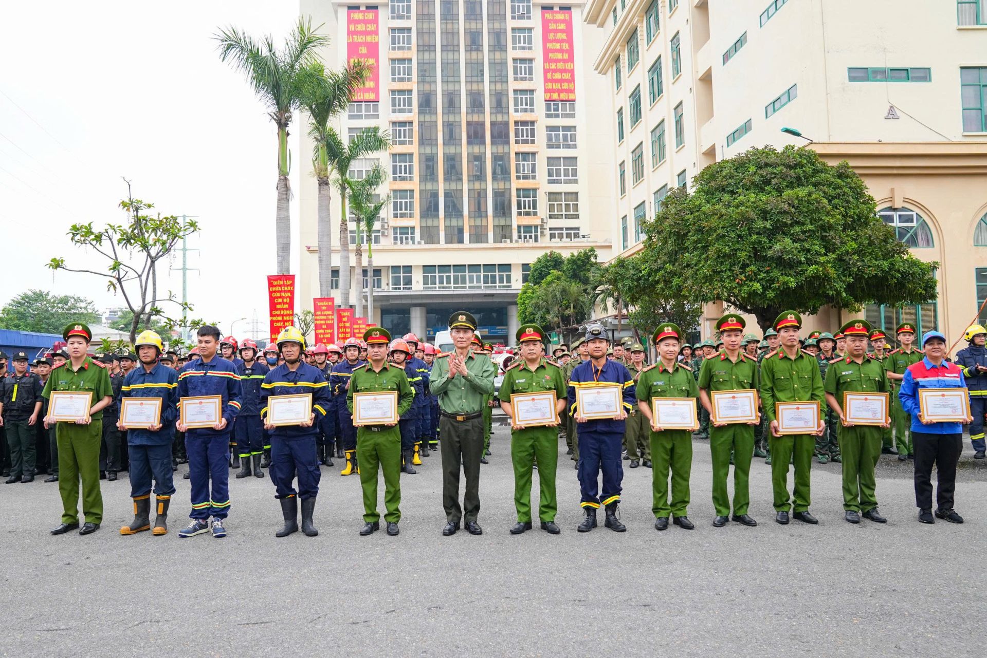 Nhân dịp này, UBND thành phố, Công an thành phố khen thưởng các tập thể và cá nhân có thành tích xuất sắc trong công tác chuẩn bị, tổ chức và tham gia diễn tập phương án chữa cháy, cứu nạn, cứu hộ năm 2025, góp phần lan tỏa phong trào “Toàn dân tham gia phòng cháy, chữa cháy” trên địa bàn.