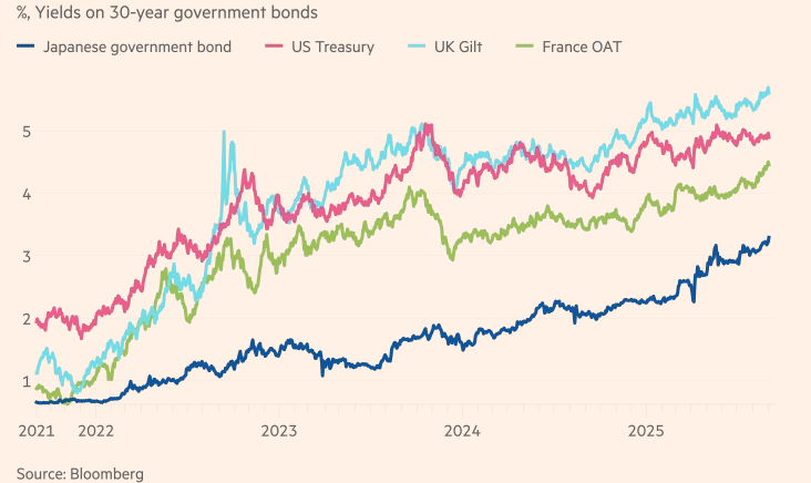 Tại Mỹ, lợi suất trái phiếu Chính phủ Mỹ kỳ hạn 30 năm đã vượt ngưỡng 5% lần đầu tiên kể từ tháng 7. Đồng thời, lợi suất trái phiếu Chính phủ 30 năm của Nhật Bản đạt mức cao kỷ lục, tăng 100 điểm cơ bản trong năm nay giữa bối cảnh lạm phát dai dẳng và bất ổn chính trị. Tại châu Âu, trái phiếu Chính phủ 30 năm của Anh chạm mức cao nhất kể từ năm 1998, trong khi tại Pháp, phần bù rủi ro cho trái phiếu kỳ hạn 30 năm tăng vọt lên mức chưa từng thấy kể từ năm 2008.