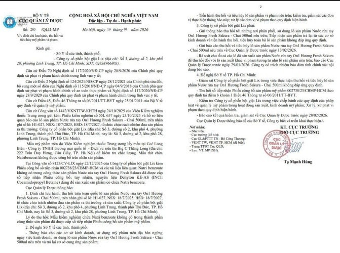 Mới đây, Cục Quản lý Dược đã ban hành Công văn số 205/QLD-MP ngày 19/01/2026 về việc đình chỉ lưu hành, thu hồi trên phạm vi toàn quốc đối với lô sản phẩm Nước rửa tay On1 Hương Fresh Sakura – chai 500ml. Trên nhãn sản phẩm ghi số lô H1-027, ngày sản xuất 18/7/2025, hạn sử dụng 18/7/2027.