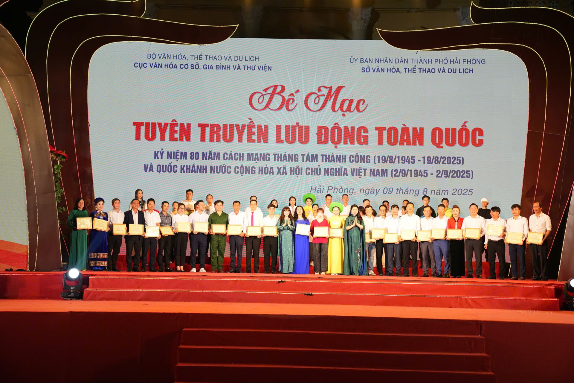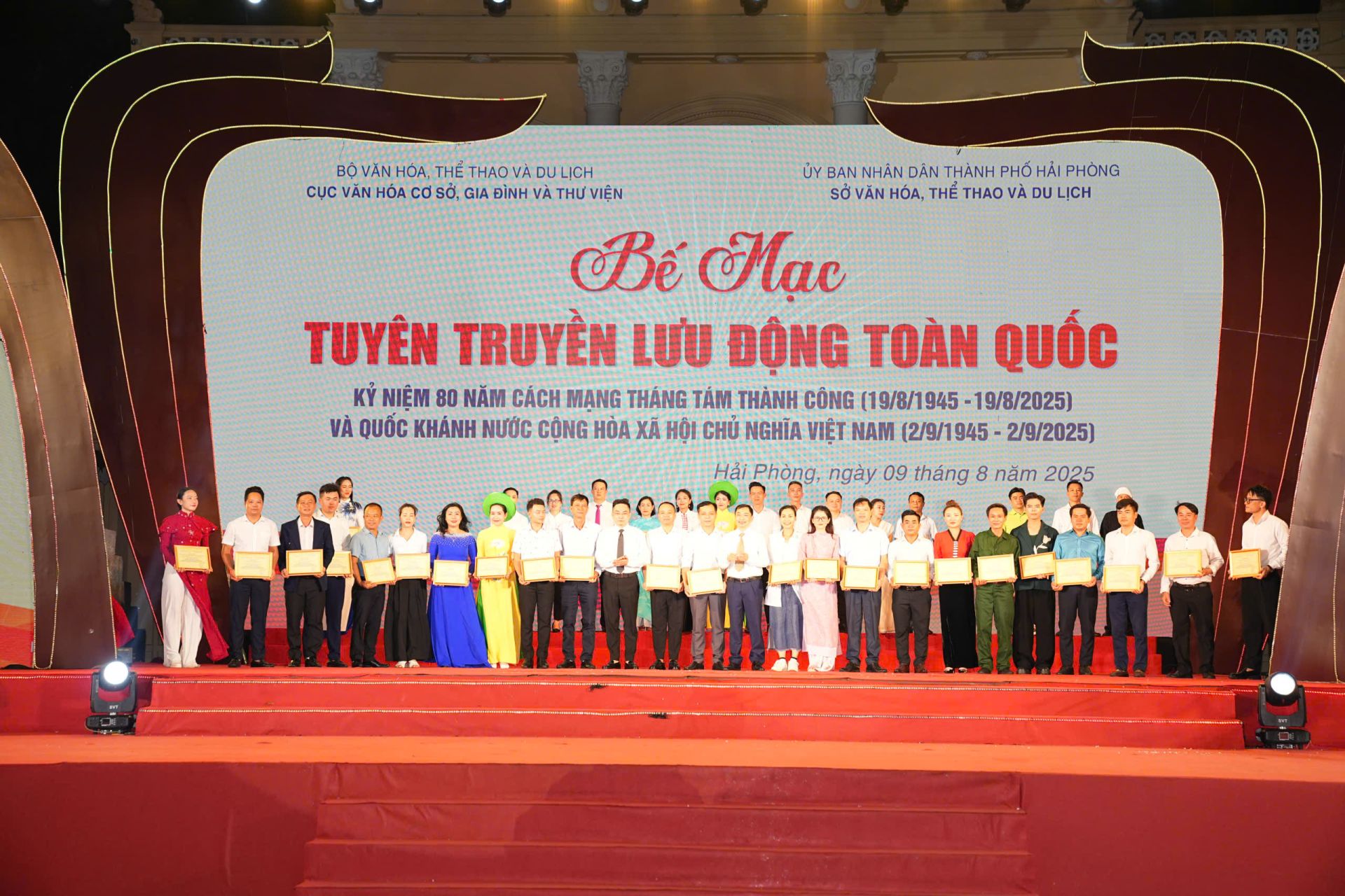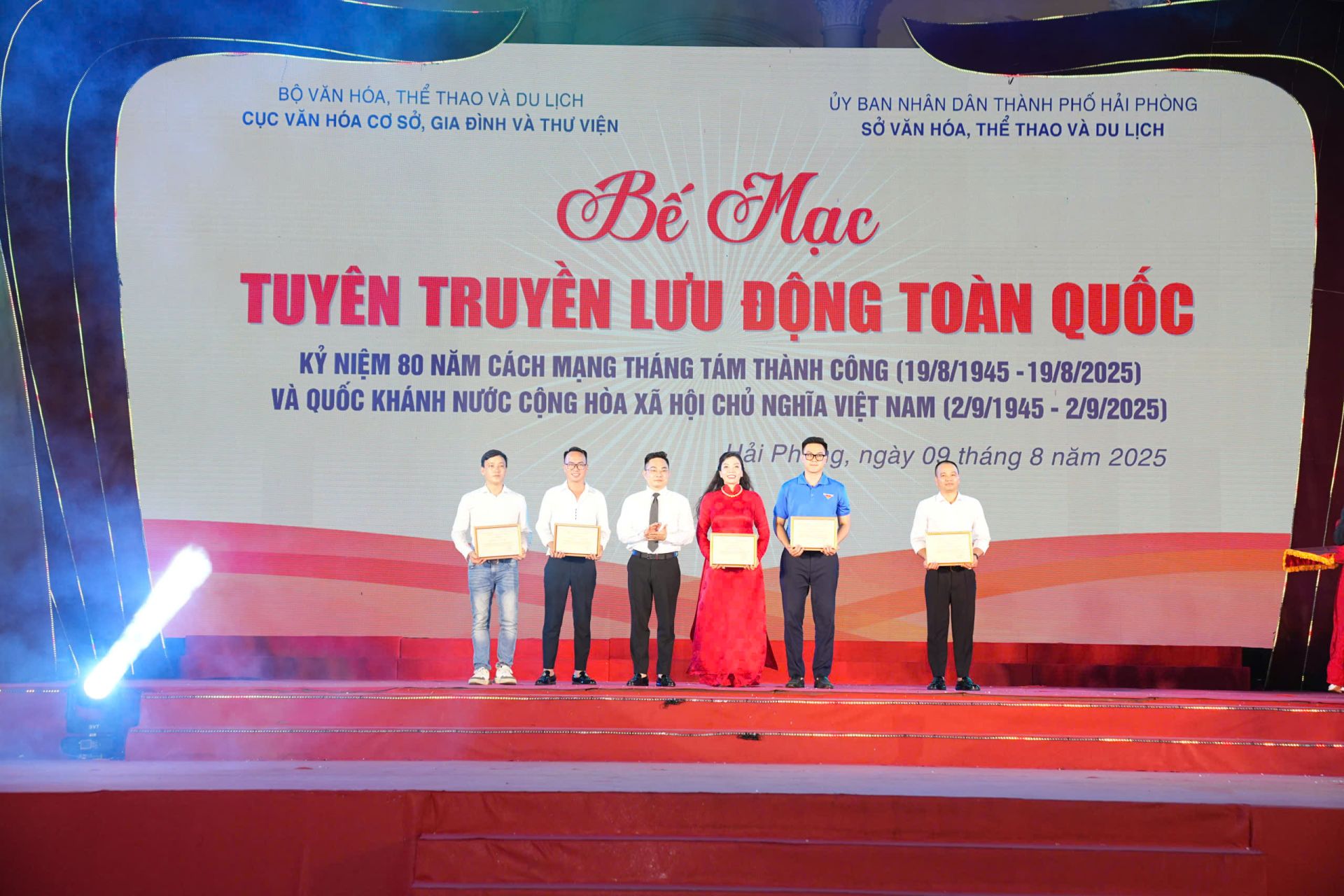 Trong đó, Phòng Quản lý Văn hóa và Gia đình, Sở Văn hóa Thể thao và Du lịch thành phố; Trung tâm Văn hóa Điện ảnh và Triển lãm thành phố; bà Đinh Thị Bích Liên, Giám đốc Trung tâm Văn hóa, Điện ảnh và Triển lãm thành phố Hải Phòng và ông Bùi Huy Đức, tuyên truyền viên Đội tuyên truyền lưu động Trung tâm Văn hóa, Điện ảnh và Triển lãm thành phố được nhận Giấy khen của Cục Văn hoá cơ sở, Gia đình và Thư viện.
