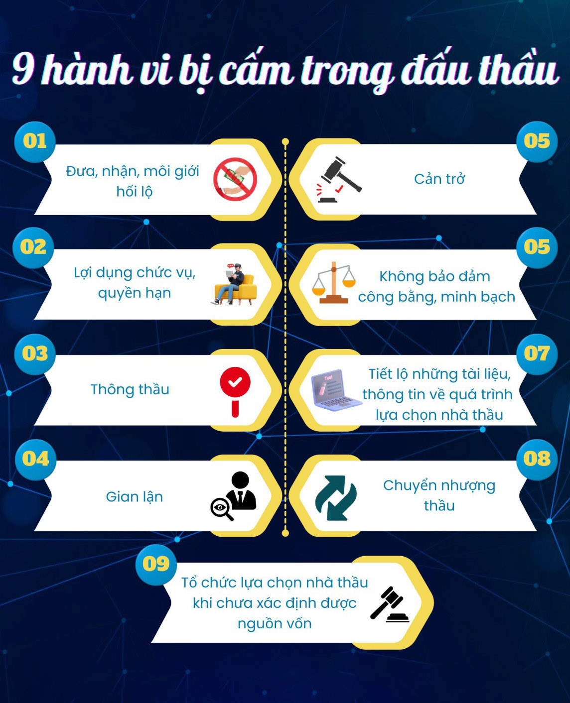 Tại Điều 16 Luật Đấu thầu 2023 quy định 9 hành vi bị cấm trong hoạt động đấu thầu, như sau: 1) Đưa, nhận, môi giới hối lộ;