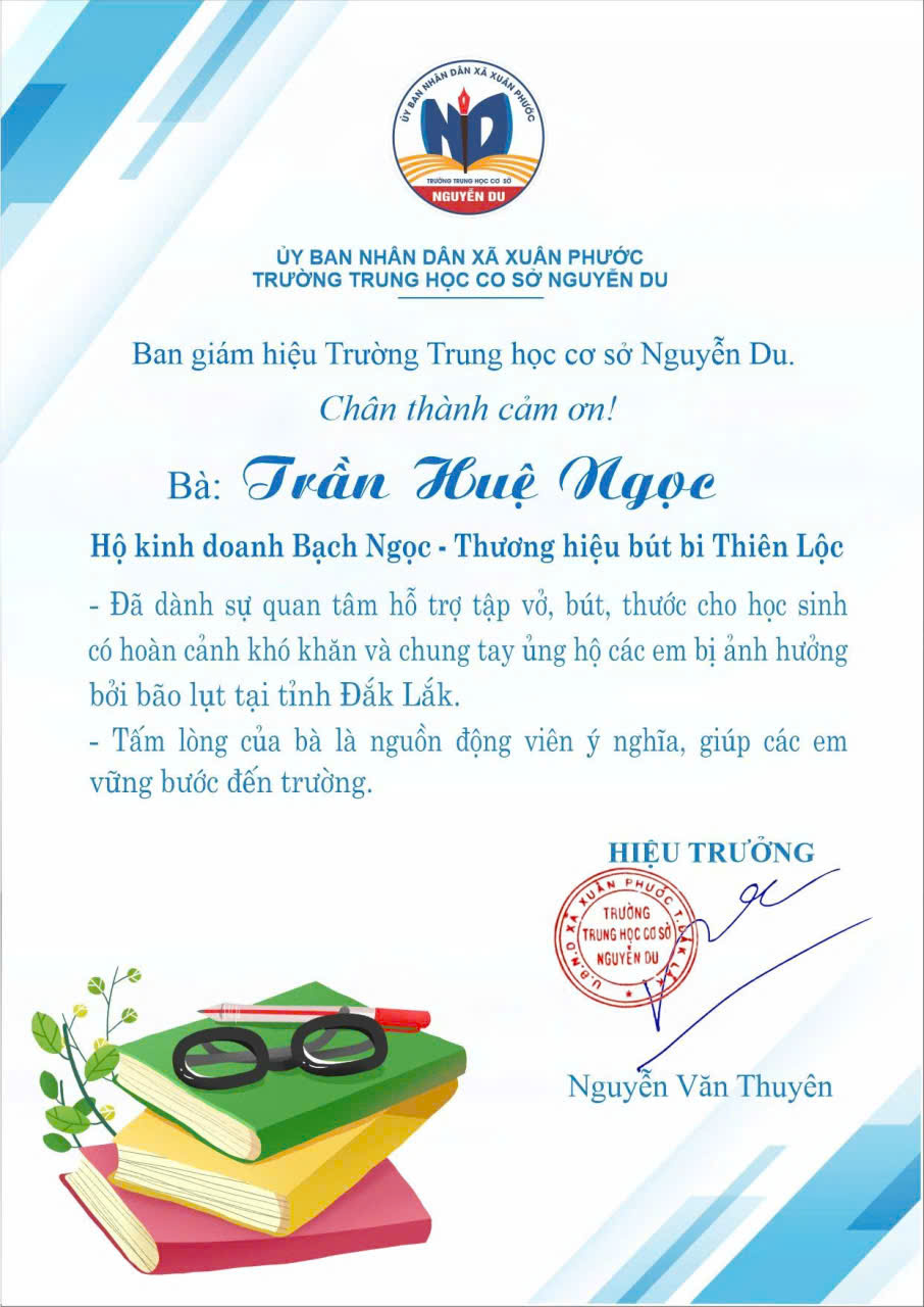 Theo đại diện nhà trường, sự sẻ chia kịp thời này không chỉ mang ý nghĩa vật chất mà còn góp phần động viên tinh thần, giúp học sinh sớm ổn định tâm lý, tiếp tục đến trường sau thiên tai. Ban Giám hiệu Trường THCS Nguyễn Du (xã Xuân Phước) đã có thư ghi nhận và bày tỏ sự cảm ơn trước nghĩa cử cao đẹp của doanh nhân Trần Huệ Ngọc và thương hiệu Bút bi Thiên Lộc.