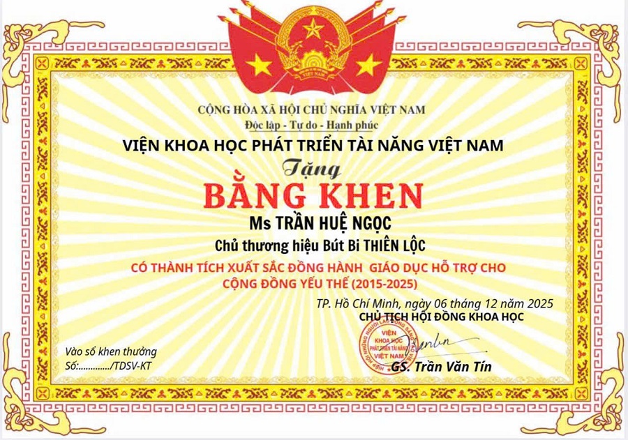 Ngày 6/12/2025, bà Trần Huệ Ngọc được Viện Khoa học Phát triển Tài năng Việt Nam trao Bằng khen vì “Có thành tích xuất sắc trong việc đồng hành giáo dục, hỗ trợ cộng đồng yếu thế giai đoạn 2015–2025”. Lễ trao bằng khen được tổ chức trong khuôn khổ chương trình kỷ niệm 33 năm Ngày Quốc tế người khuyết tật (3/12/2025), nhằm tôn vinh các cá nhân, tổ chức có nhiều đóng góp tích cực cho các nhóm yếu thế trong xã hội. Tại đây, bà Trần Huệ Ngọc và Bút bi Thiên Lộc cũng trao tặng nhiều phần quà ý nghĩa cho các em thanh niên khuyết tật.