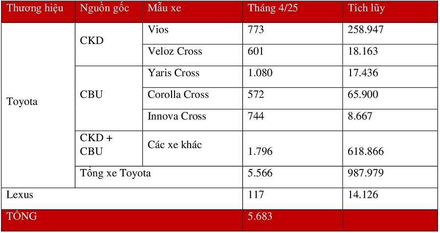 Cụ thể, doanh số toàn quốc của các mẫu xe Toyota đạt 5.566 xe, bao gồm 1.682 xe lắp ráp trong nước và 3.884 xe nhập khẩu nguyên chiếc, ghi nhận mức tăng 24% so với cùng kỳ năm ngoái (tháng 4/2024). Tổng số xe Toyota tích lũy đến nay đạt gần 988.000 xe, ngày càng hướng gần hơn tới mốc doanh số 1 triệu xe trong năm 2025 - kỷ niệm 30 năm Toyota có mặt tại Việt Nam.