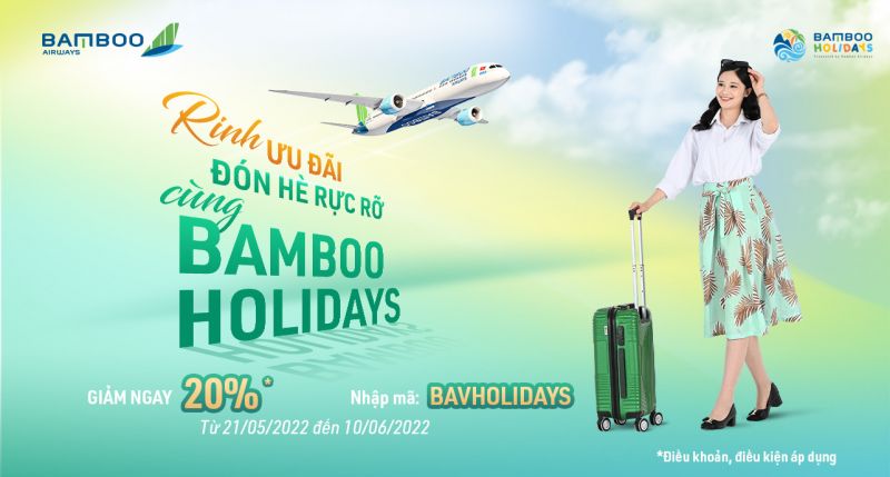 Cụ thể, hành khách sẽ được giảm 20% giá vé máy bay (giá vé cơ sở), khi đặt gói sản phẩm bao gồm vé máy bay và dịch vụ khách sạn trên nền tảng Bamboo Holidays và sử dụng mã ưu đãi BAVHOLIDAYS. Chương trình ưu đãi kéo dài từ nay đến 10/06/2022 với thời gian bay áp dụng đến hết 31/10/2022, không loại trừ đường bay và giai đoạn bay.
