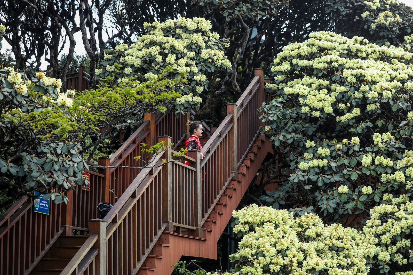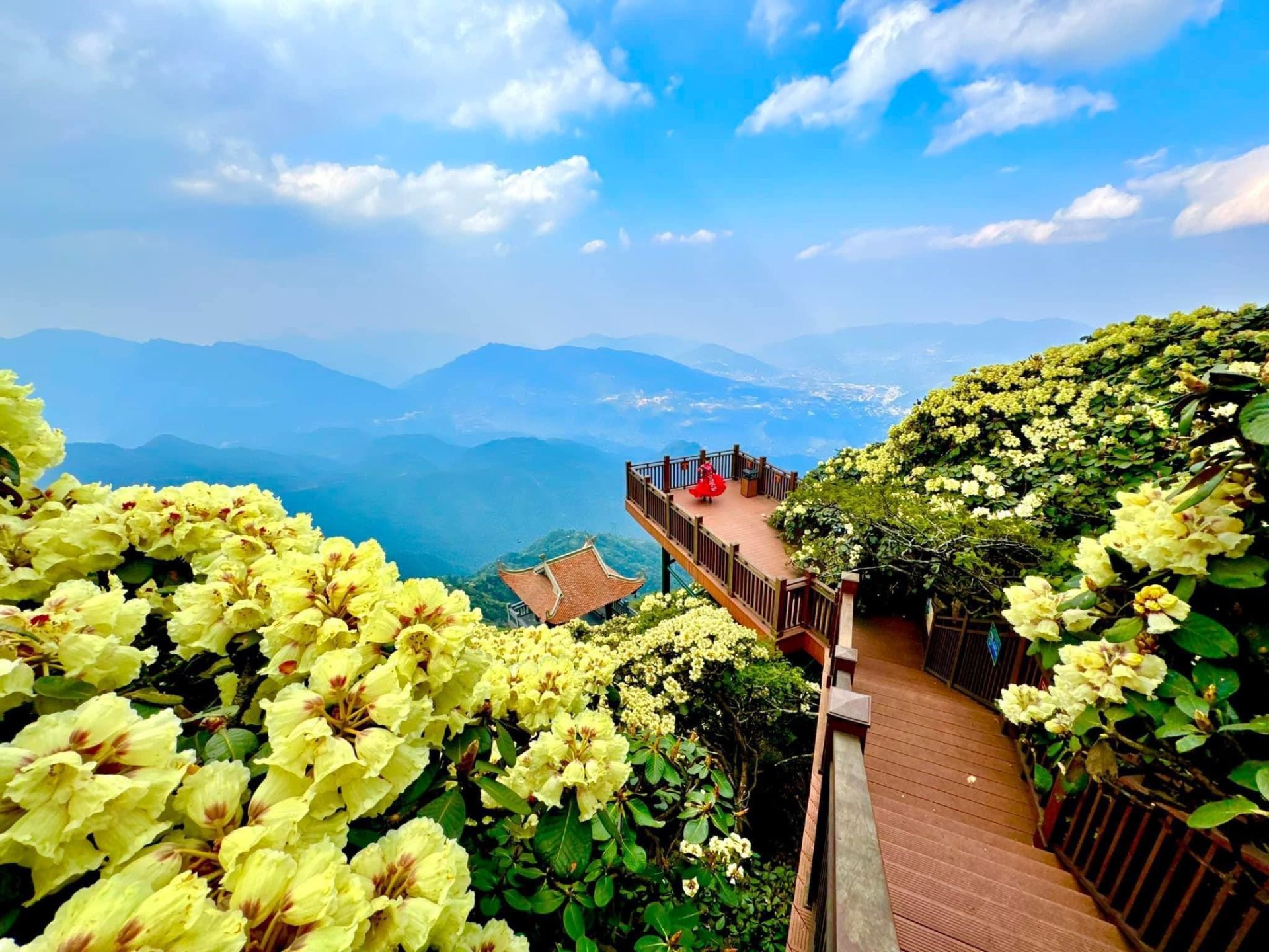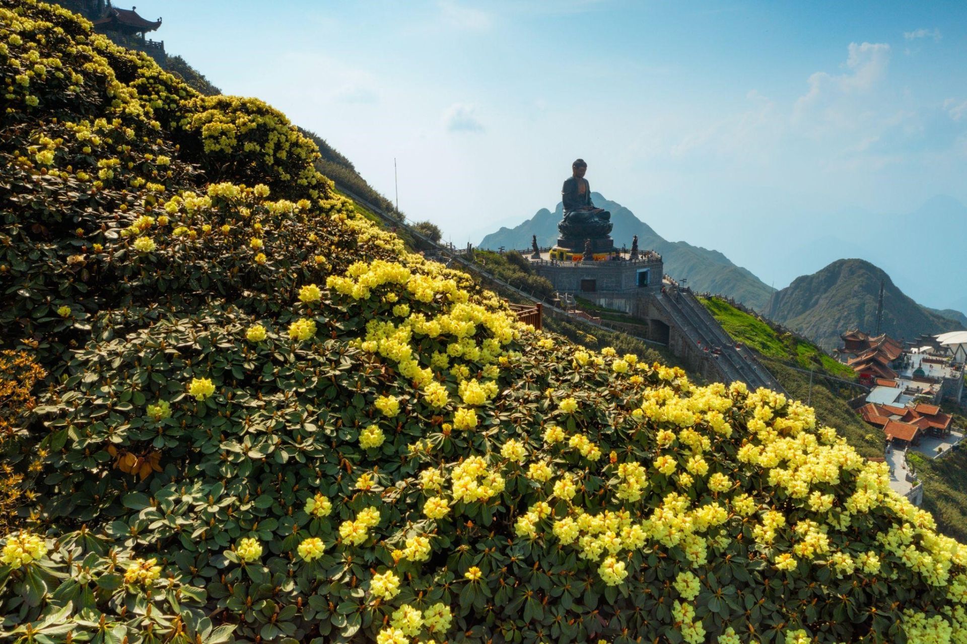 Bên cạnh đó, những cung đường ngập tràn sắc hoa đẹp nhất tại Fansipan luôn chào đón du khách. Dạo bước trên đường La Hán, khu vực quanh tượng Quan Thế Âm Bồ Tát và Kim Sơn Bảo Thắng Tự, nằm ở độ cao 3.000m, bạn sẽ thấy bạt ngàn hoa đỗ quyên đỏ và vàng. Đặc biệt, KDL Sun World Fansipan Legend đã xây dựng hai Đường hoa đỗ quyên tại các khu vực này để du khách có thể chiêm ngưỡng loài hoa này ở cự ly gần nhất và thỏa sức bắt trọn toàn cảnh núi rừng Tây Bắc đẹp mê mẩn.