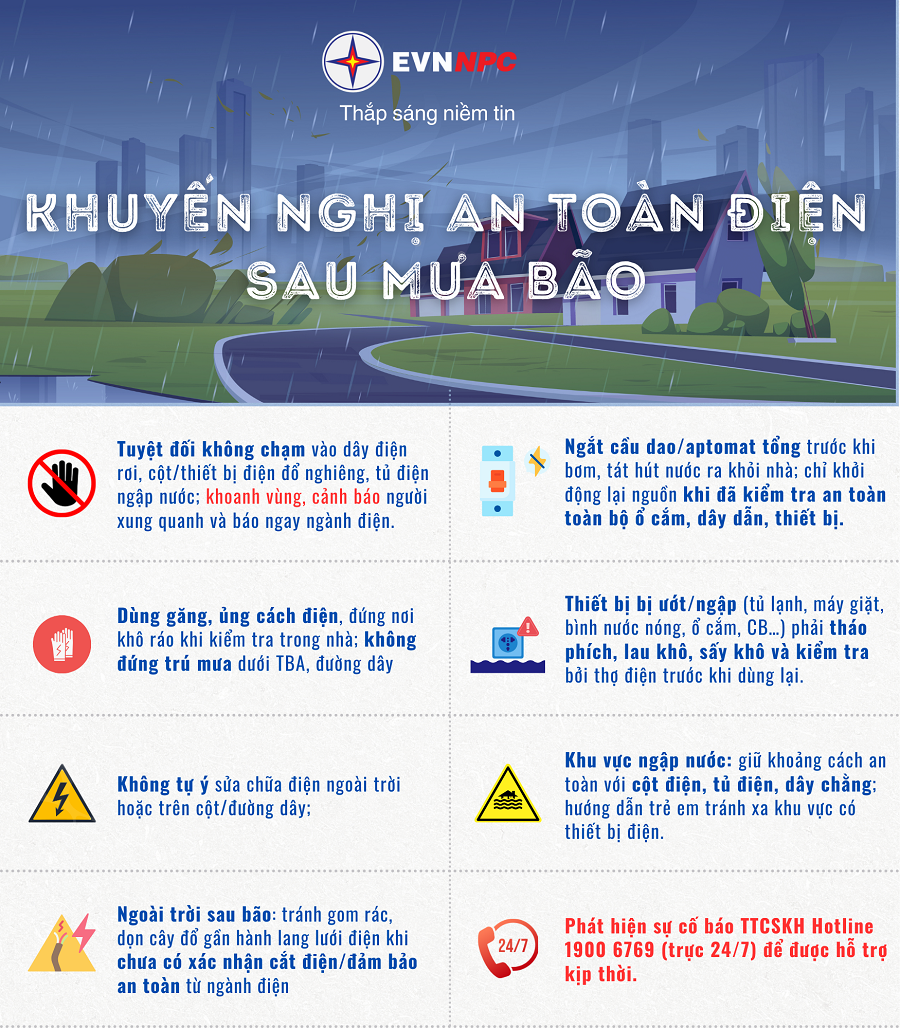 Trong thời gian khắc phục sự cố sau mưa bão, Tổng công ty Điện lực miền Bắc xin khuyến nghị khách hàng các biện pháp an toàn điện sau: