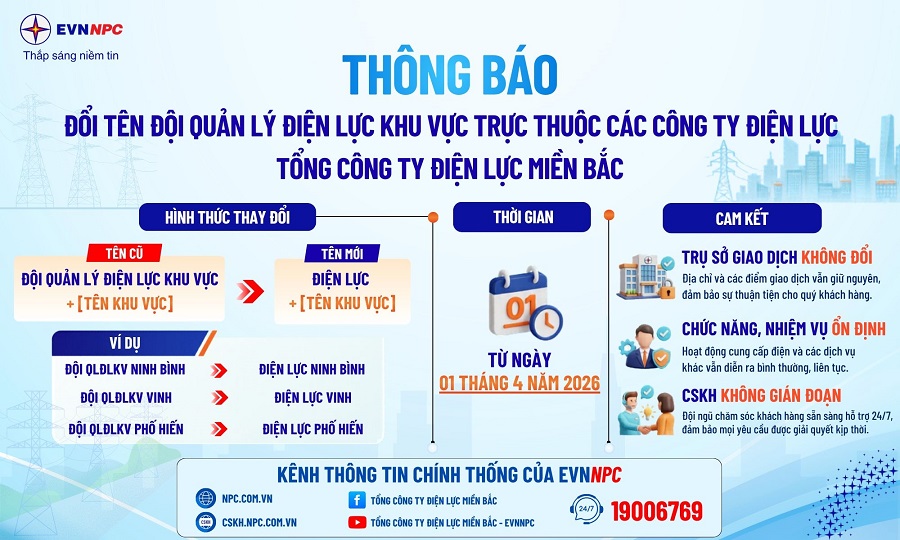 EVNNPC khẳng định toàn bộ hoạt động cung cấp điện và dịch vụ khách hàng vẫn được duy trì ổn định, liên tục. Các trụ sở và điểm giao dịch không thay đổi; hoạt động quản lý vận hành lưới điện được bảo đảm thông suốt; công tác chăm sóc khách hàng tiếp tục được duy trì 24/7, sẵn sàng tiếp nhận và giải quyết kịp thời các yêu cầu của người dân và doanh nghiệp.
