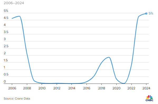 Tại sao các quỹ thị trường tiền tệ sẽ tiếp tục thu hút dòng tiền dù Fed giảm lãi suất? Theo ông Crane, câu trả lời nằm ở sự chênh lệch đáng kể giữa lợi suất của các quỹ này so với tiền gửi ngân hàng truyền thống.