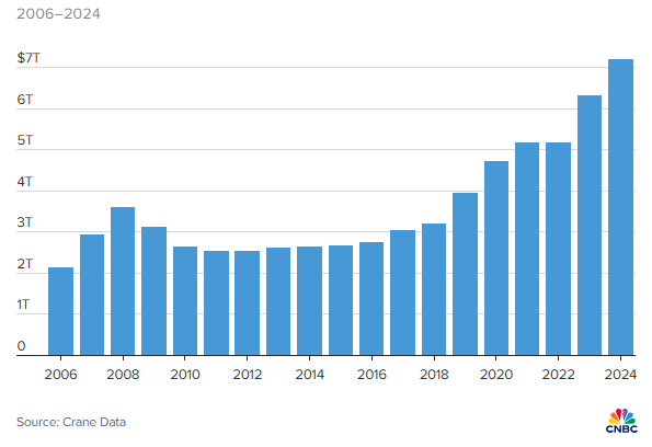 Mặc dù không phủ nhận hoàn toàn khả năng dòng tiền di chuyển, ông Crane ước tính chỉ khoảng 10% trong số 7,000 tỷ USD có thể chuyển sang các khu vực đầu tư rủi ro cao hơn, dù ông thừa nhận không có dữ liệu để đưa ra con số chính xác.