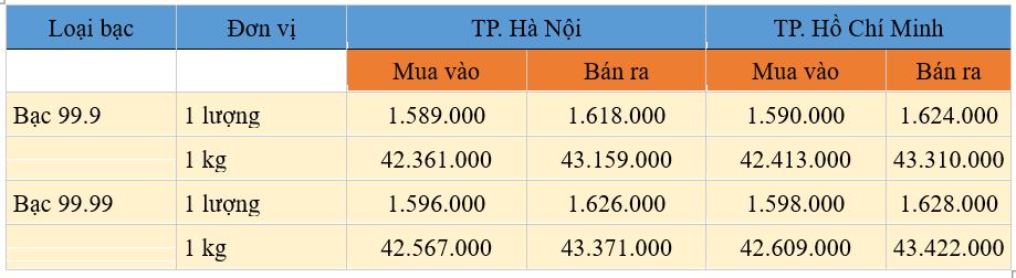 Khảo sát tại các địa điểm giao dịch khác ở Hà Nội, giá bạc trong nước tăng cả chiều mua và chiều bán, hiện được niêm yết ở mức 1.589.000 đồng/lượng (mua vào) và 1.618.000 đồng/lượng (bán ra).