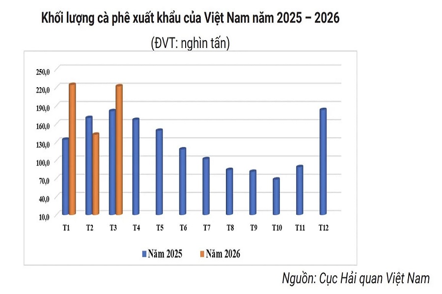 Trong nước, xuất khẩu cà phê tháng 3/2026 ghi nhận sự phục hồi nhờ nguồn cung sau thu hoạch gia tăng và tiến độ giao hàng được đẩy nhanh. Khối lượng xuất khẩu đạt khoảng 222 nghìn tấn, trị giá hơn 990 triệu USD, tăng 15,6% về lượng nhưng giảm 11,5% về giá trị so với cùng kỳ năm trước.