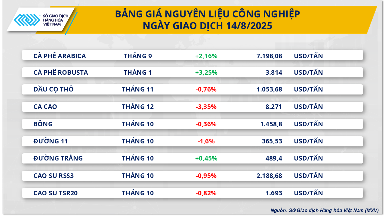 Trên thị trường nguyên liệu công nghiệp, giá cà phê bứt phá mạnh khi nguy cơ đứt gãy chuỗi cung ứng gia tăng do mức thuế cao áp lên cà phê Brazil, làm dấy lên lo ngại thiếu hụt hàng hóa trên thị trường thế giới.