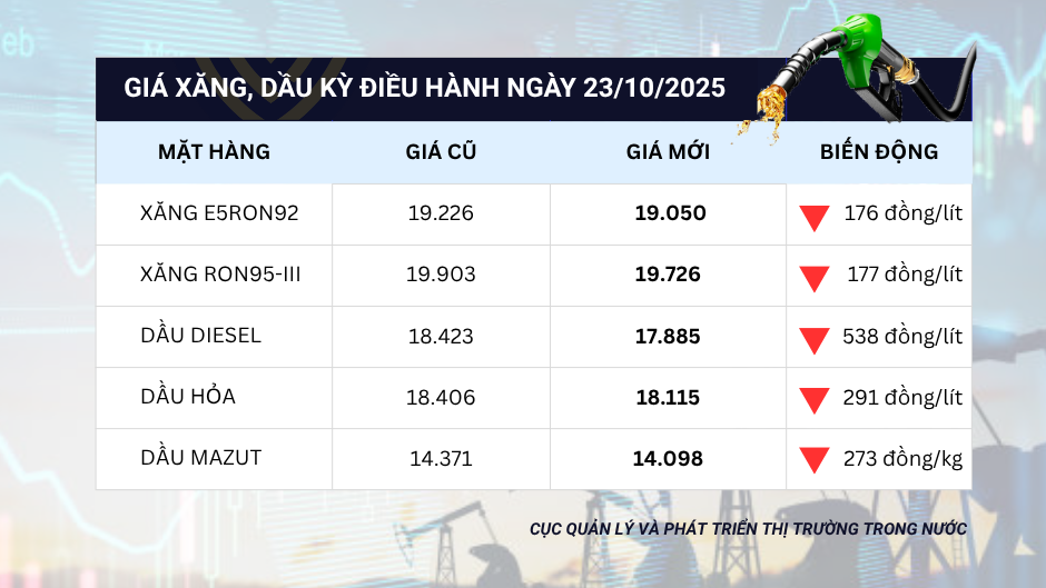Bình quân giá thành phẩm xăng dầu thế giới giữa kỳ điều hành giá ngày 16/10/2025 và kỳ điều hành ngày 23/10/2025 là: 75,375 USD/thùng xăng RON92 dùng để pha chế xăng E5RON92; 78,203 USD/thùng xăng RON95; 84,355 USD/thùng dầu hỏa; 83,483 USD/thùng dầu điêzen 0,05S; 368,558 USD/tấn dầu mazut 180CST 3,5S.