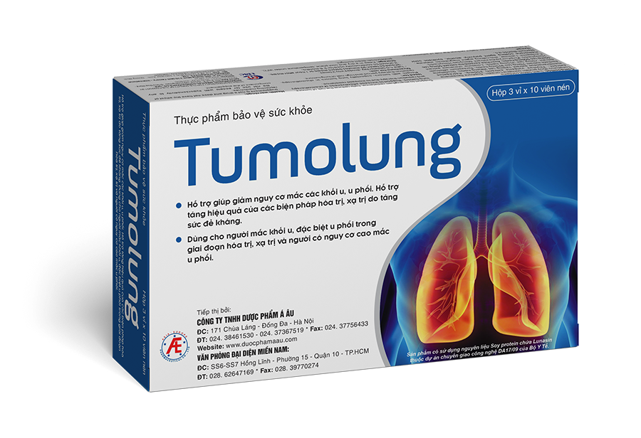 Thực phẩm bảo vệ sức khỏe Tumolung - Hỗ trợ giúp giảm nguy cơ mắc các khối u, u phổi. Dùng cho người mắc khối u, u phổi ![]() Thành phần Mỗi viên nén bao gồm: ● Lunatumo (Đạm đậu nành chứa Lunasin, Cao khổ sâm bắc, Chiết xuất Cỏ xạ hương (Thyme)) 250mg; ● Cao hoàng kỳ 120mg (tương đương 295mg dược liệu); ● Cao Bán chi liên 70mg (tương đương 370mg dược liệu); ● Cao Bồ công anh 70mg (tương đương 315mg dược liệu); ● Cao Cọ xẻ (Quy tô tử) 50mg (tương đương 550mg dược liệu); ● Cao Quả khế 50mg (tương đương 70mg dược liệu); ● Cao Mạch chủ (Candied jujube) 50mg (tương đương 70mg dược liệu). Phụ liệu: Lactose, chất chống đông vón magie stearat, chất tạo màng bao polyvinyl alcohol, chất màu tổng hợp titanium dioxide vừa đủ. Đối tượng sử dụng: Dùng cho người mắc khối u, đặc biệt u phổi trong giai đoạn hóa trị, xạ trị và người có nguy cơ cao mắc u phổi. Công dụng: ● Tăng cường chống oxy hóa, hỗ trợ giảm nguy cơ viêm nhiễm. ● Hỗ trợ tăng cường sức đề kháng, giúp giảm nguy cơ mắc các khối u, u phổi. ● Hỗ trợ tăng hiệu quả của các biện pháp hóa trị, xạ trị do tăng sức đề kháng.