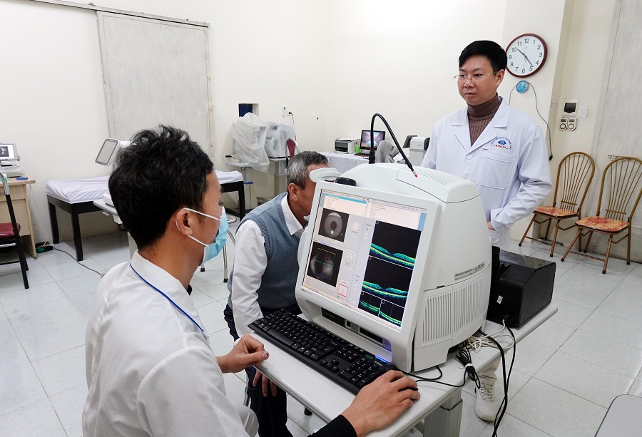 Tôi xin phép nghỉ làm 2 hôm, rồi có mặt theo hẹn. Sau khi kiểm tra bằng máy sinh hiển vi khám, Bác sỹ Hoàng Cừ chuyển cho các phòng chuyên môn tờ giấy giao việc viết tay. Tôi được nhóm anh em điều dưỡng của Bệnh viện giúp đỡ chiếu chụp và làm các xét nghiệm, trước khi tập hợp thông tin hội chẩn: Siêu âm, chụp cắt lớp võng mạc và đo công suất thể thủy tinh… Dù nhìn mờ lắm, tôi vẫn kịp hình dung ra khuôn mặt khả ái của một nữ điều dưỡng xinh xắn và dịu dàng, đã hướng dẫn rất chi tiết cho tôi về các thao tác cần thiết, giúp đồng nghiệp của cô chỉ việc “bấm máy”. Mọi động tác nhìn lên, nhìn xuống, quay phải, quay trái, đều thực hiện theo yêu cầu tự động của thiết bị.
